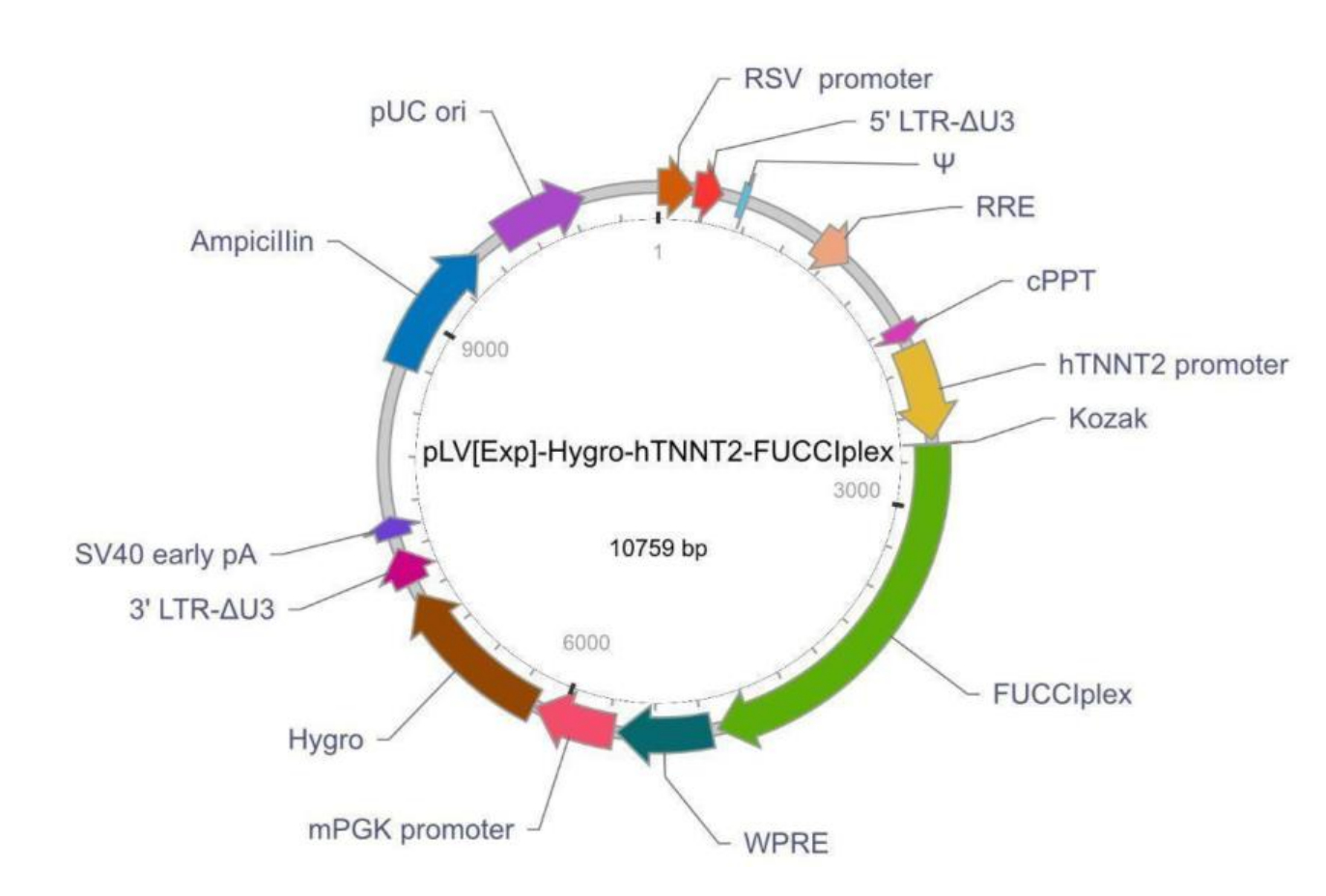 PurposeMultiplexable FUCCI sensor (FUCCIplex). The hTNNT2 promoter drives the expression of the fluorescent sensor.
