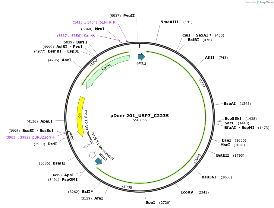 pDonr 201_USP7_C223S was a gift from Junjie Chen (Addgene plasmid # 240320 ; http://n2t.net/addgene:240320 ; RRID:Addgene_240320) -