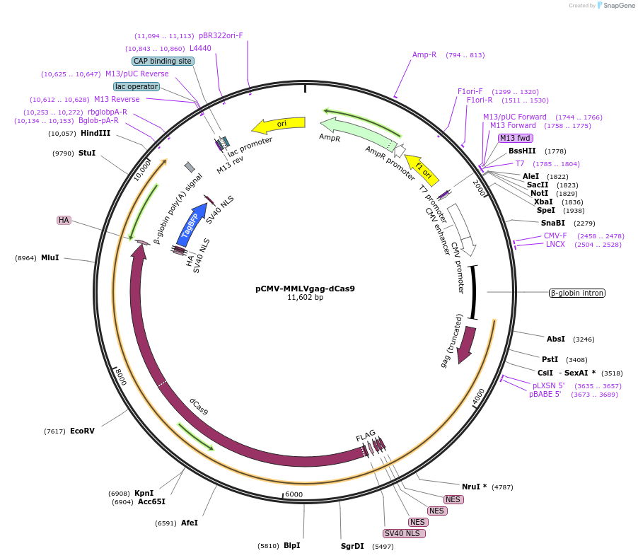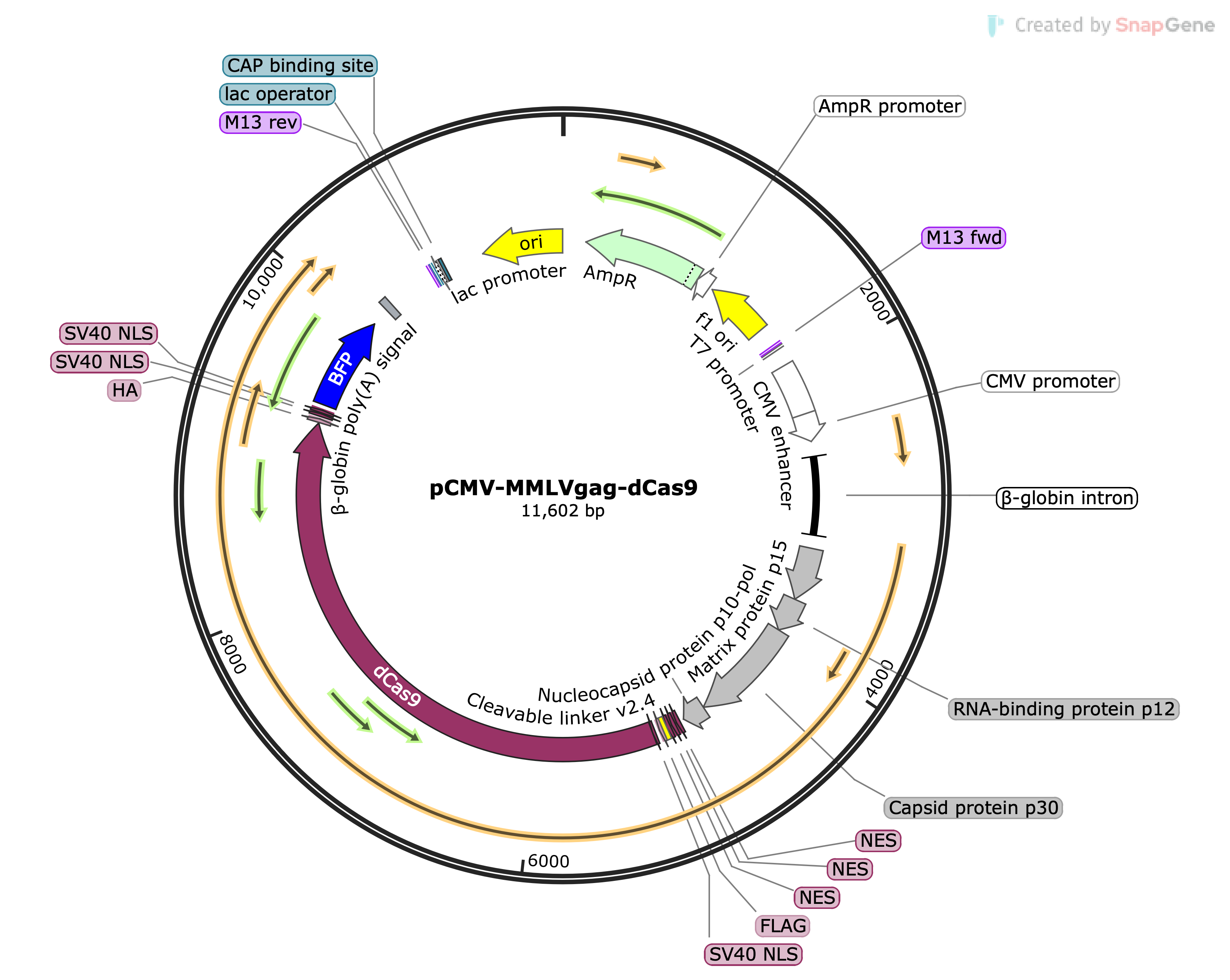 A portion of this plasmid was derived from a plasmid made byMMLVgag is from pCMV-MMLVgag-3xNES-ABE8e (Addgene plasmid #181751), dCas9 is from CRISPRoff-v2.1 (Addgene plasmid #167981)