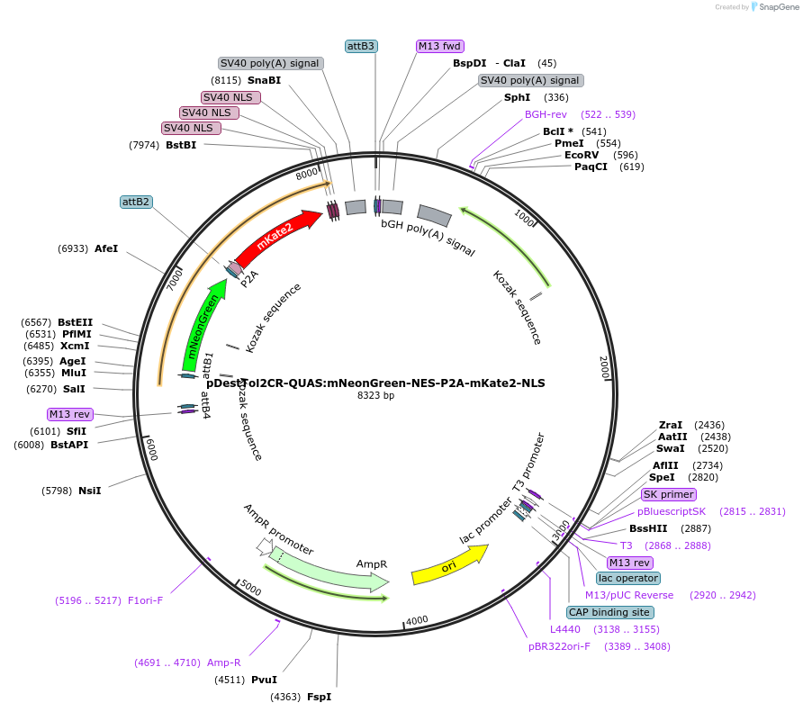 PurposeZebrafish transgenesis plasmid encoding cytoplasmic mNeonGreen-NES and mKate2-NLS separated by the P2A peptide, driven by the QUAS enhancer, and including a cmlc2:mKate2 cardiac transgenesis marker