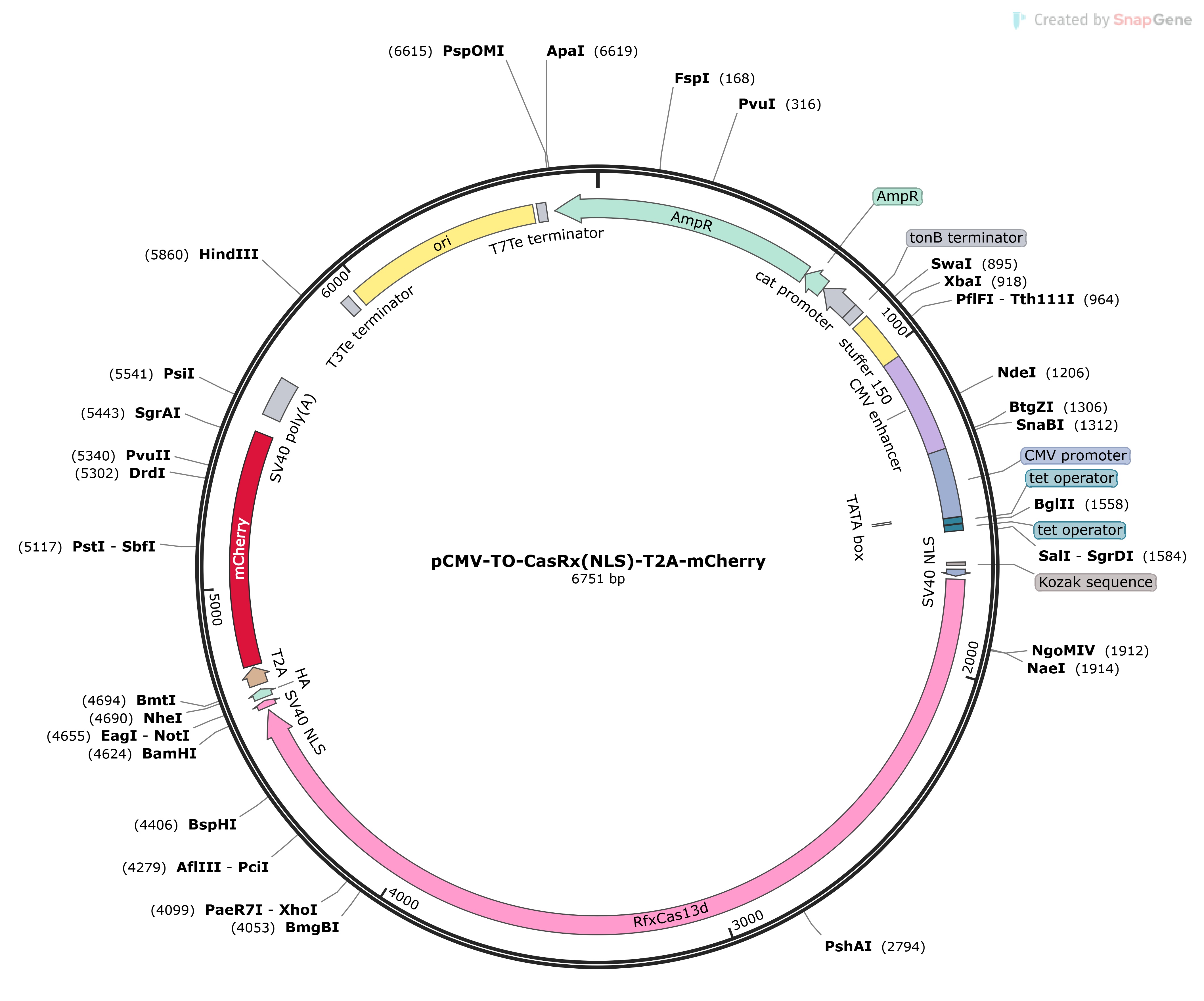 pCMV-TO-CasRx(NLS)-T2A-mCherry was a gift from Diego Di Bernardo (Addgene plasmid # 242433 ; http://n2t.net/addgene:242433 ; RRID:Addgene_242433) -