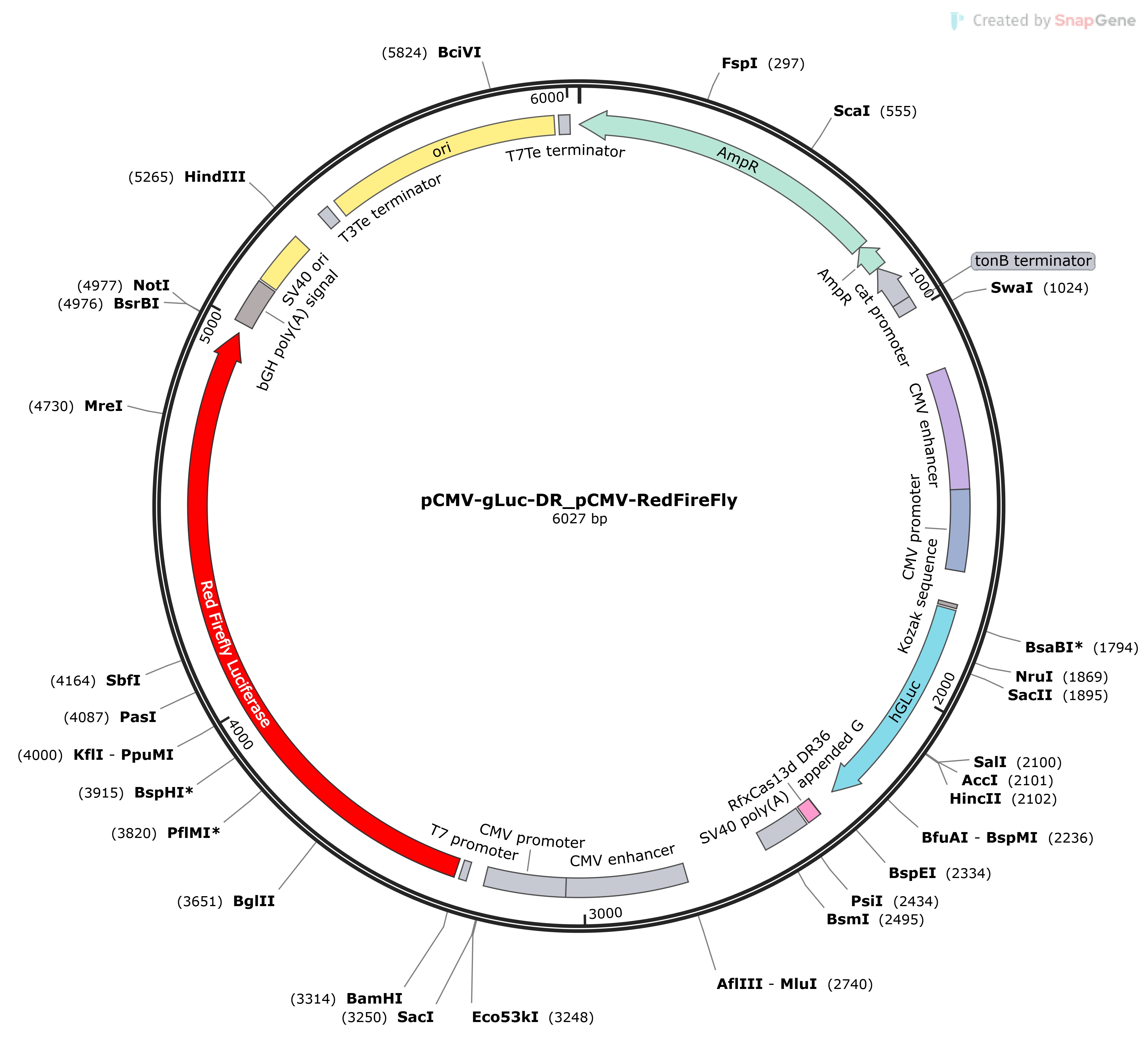 PurposeGaussia Luciferse with a Direct Repeat sequence in the 3’UTR recognised by the CasRx under the control of the CMV promoter, and a RedFirefly Luciferase driven by a CMV promoter.