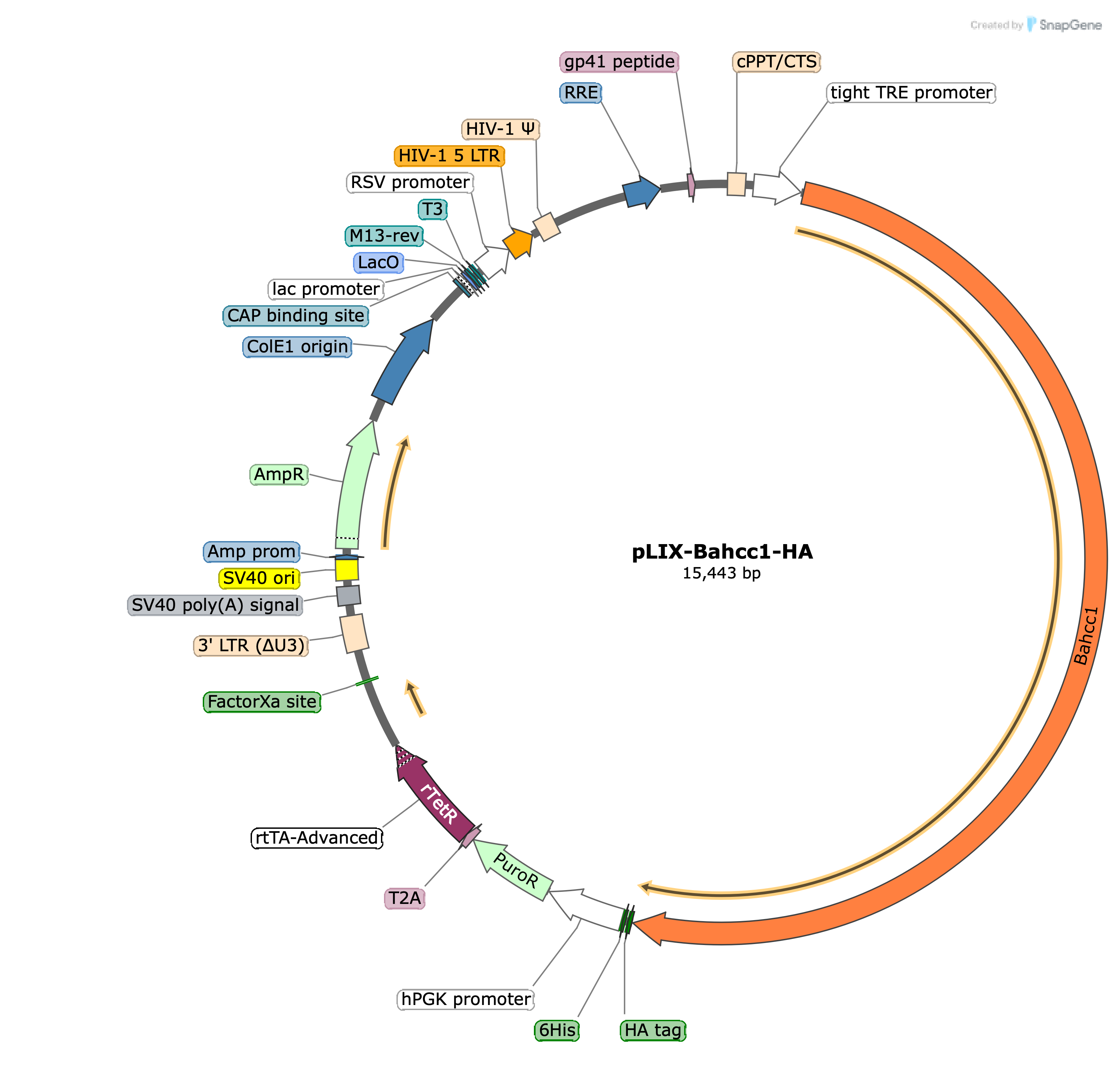 pLIX-Bahcc1-HA was a gift from Igor Ulitsky (Addgene plasmid # 242754 ; http://n2t.net/addgene:242754 ; RRID:Addgene_242754) -