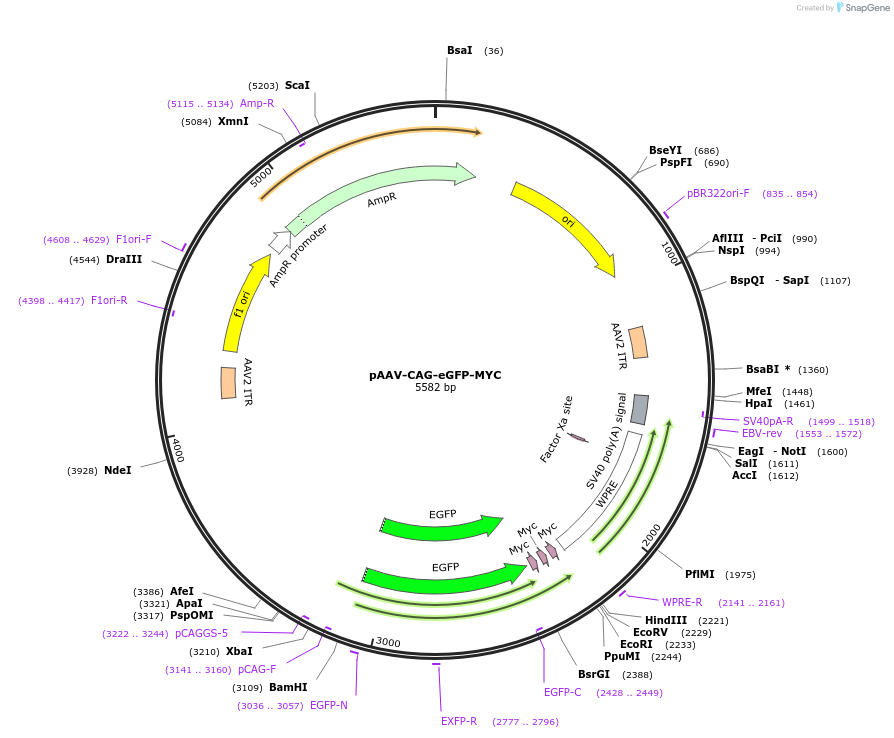 PurposeAAV transfer plasmid expressing eGFP-MYC under a CAG promoter.