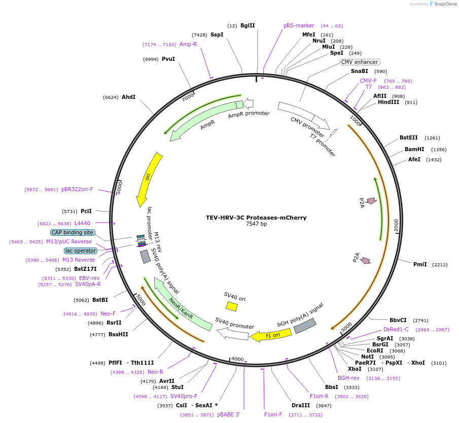 PurposeEncodes for mammalian expression of TEV and HRV-3C protease inputs. Construct contains a mCherry to indicate successful transfection and full plasmid read-through. Each protein is separated by a P2A self-cleaving sequence.