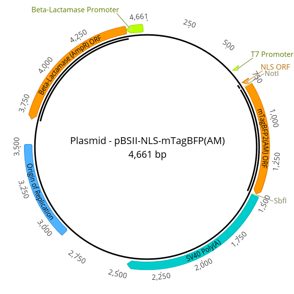 pBSII-NLS-mTagBFP(AM) was a gift from Frederic Strobl (Addgene plasmid # 244808 ; http://n2t.net/addgene:244808 ; RRID:Addgene_244808)
