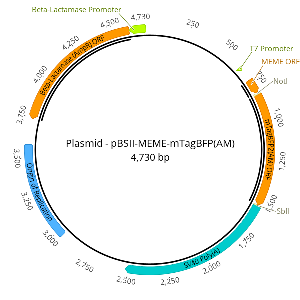 pBSII-MEME-mTagBFP(AM) was a gift from Frederic Strobl (Addgene plasmid # 244810 ; http://n2t.net/addgene:244810 ; RRID:Addgene_244810)