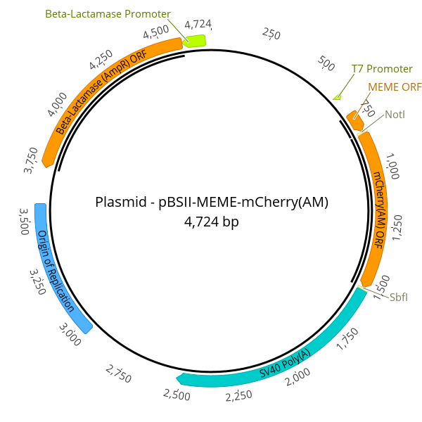 pBSII-MEME-mCherry(AM) was a gift from Frederic Strobl (Addgene plasmid # 244816 ; http://n2t.net/addgene:244816 ; RRID:Addgene_244816)
