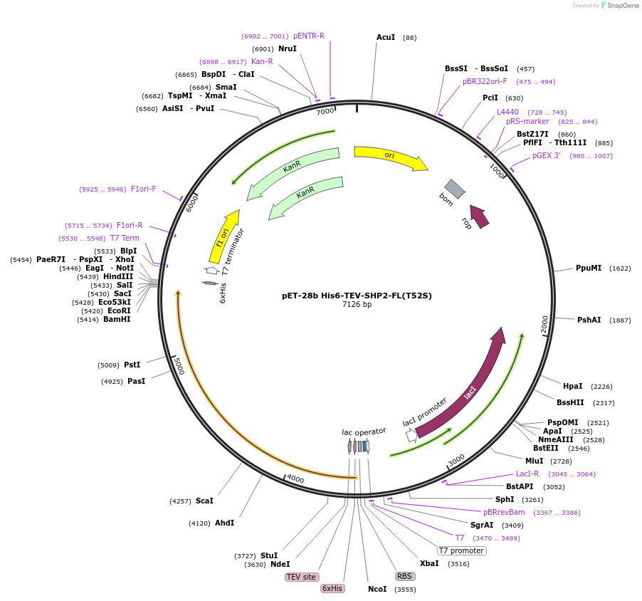 pET-28b His6-TEV-SHP2-FL(T52S)