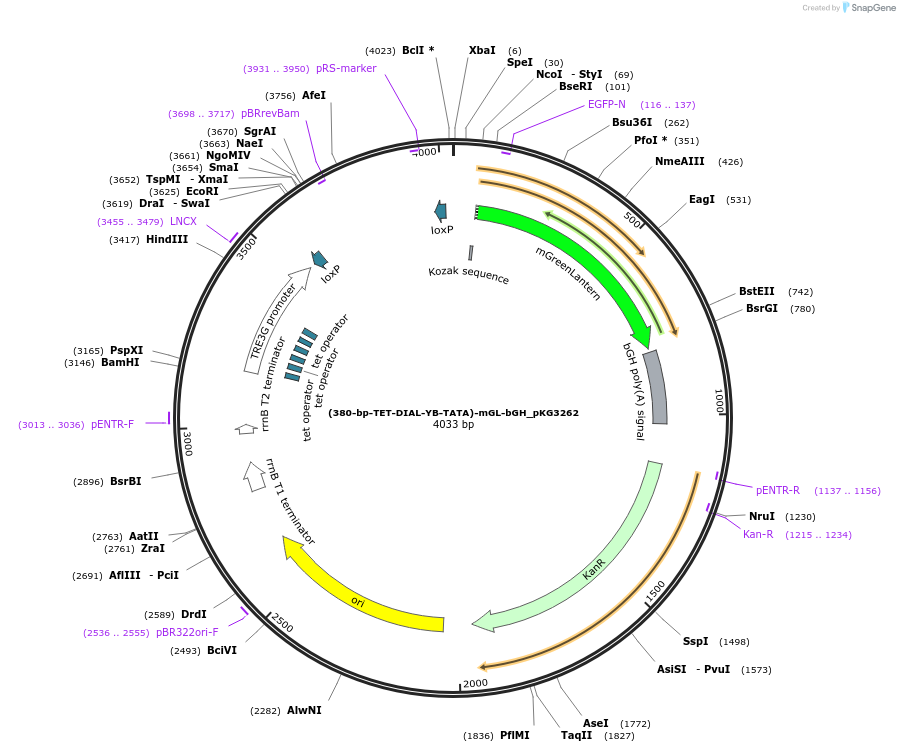Purpose380-bp DIAL Reporter Plasmid with YB_TATA expressing mGreenLantern in the presence of DOX and rtTA and editable by Cre recombinase