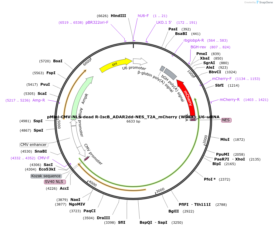 pMini-CMV-NLS-dead R-IscB_ADAR2dd-NES_T2A_mCherry (W98X)_U6-ωRNA