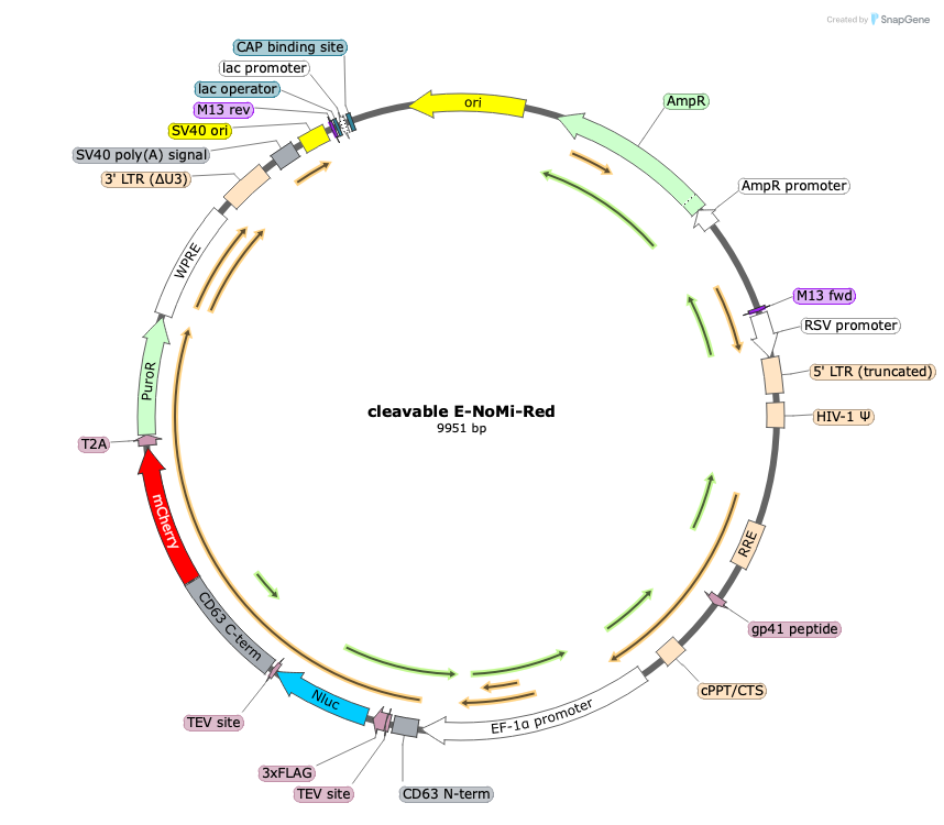 PurposeEF-1alpha driven EV reporter E-'No'Mi-R, a re-engineered tetraspanin scaffold tagged with bioluminescent and fluorescent reporter proteins. Nanoluc and Flag tag are removable with TEVp.