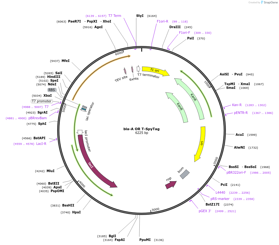 Full gene insert: MGSS-bla-GGS(x3)-2A9c-GGS(x3)-TEVc-GGS(x3)-SpyTag-GGS(x3)-6xHis
