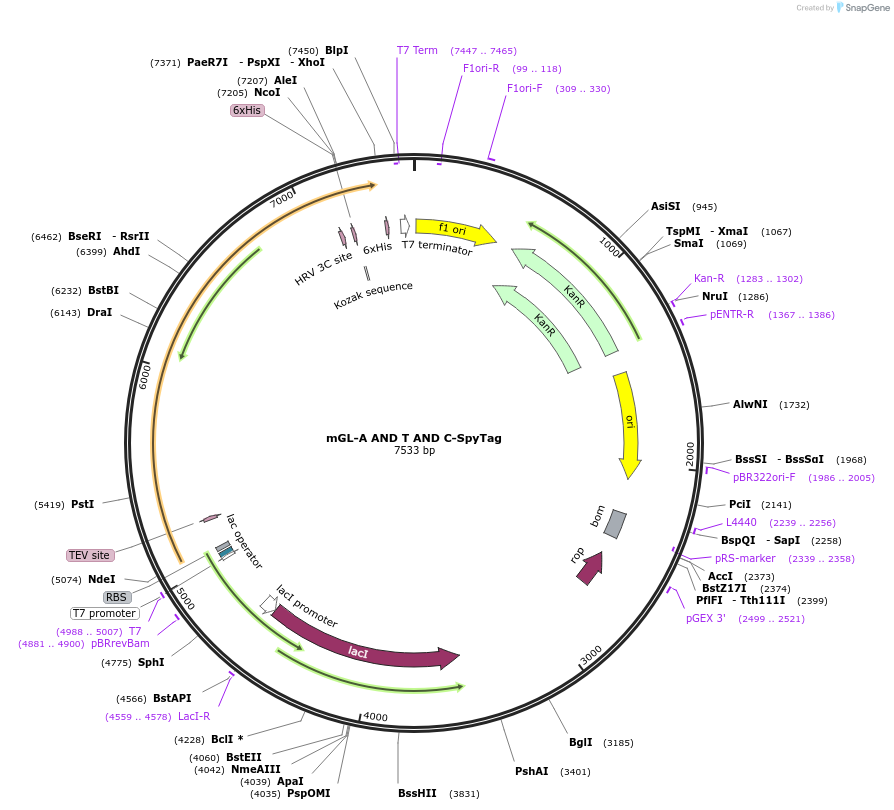mGL-A AND T AND C-SpyTag was a gift from Cole DeForest (Addgene plasmid # 246949 ; http://n2t.net/addgene:246949 ; RRID:Addgene_246949) -