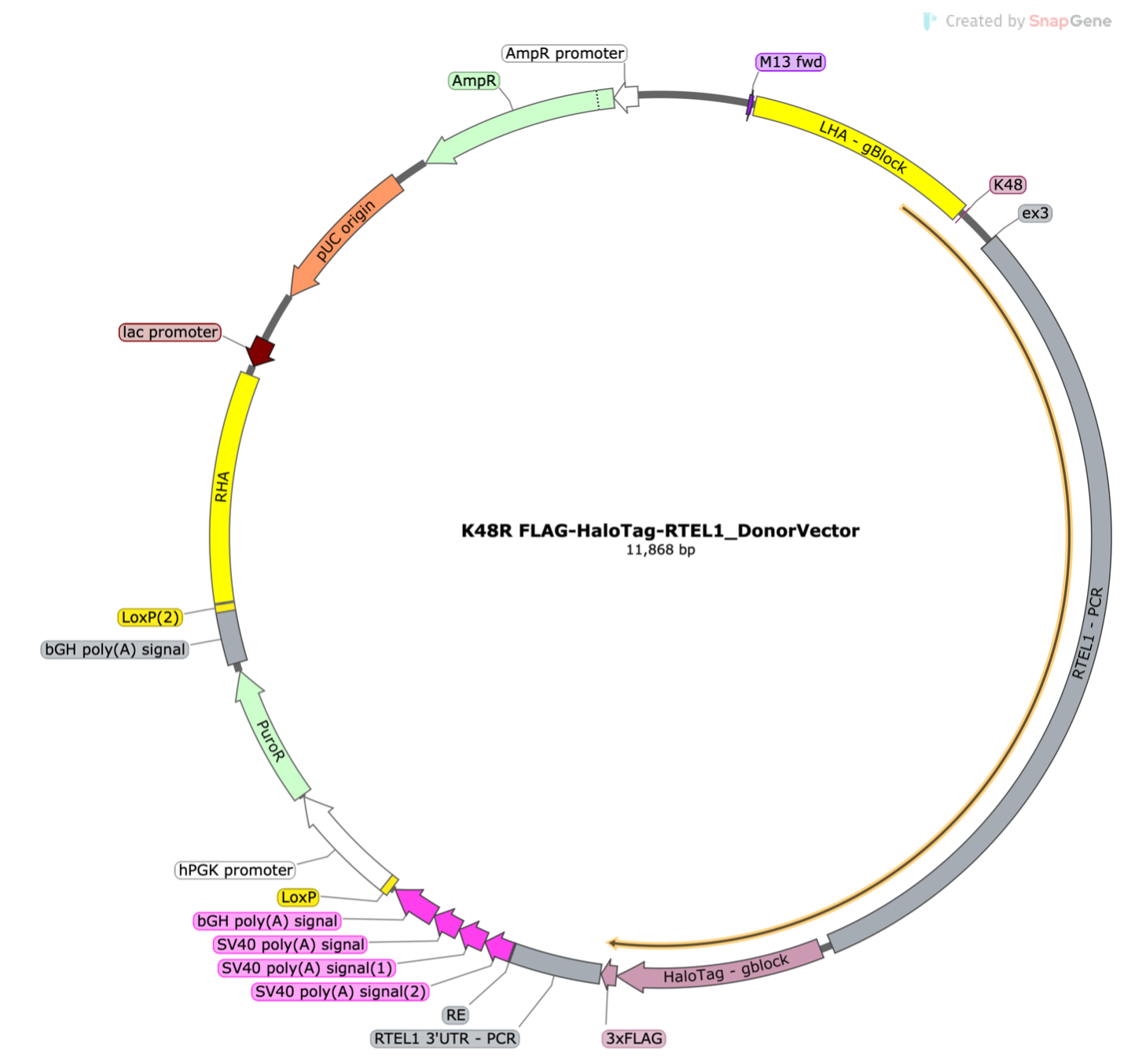 PurposeHR Donor for K48R C-terminal FLAG-HaloTag-RTEL1 fusion in human cells. Includes Puro selection marker.