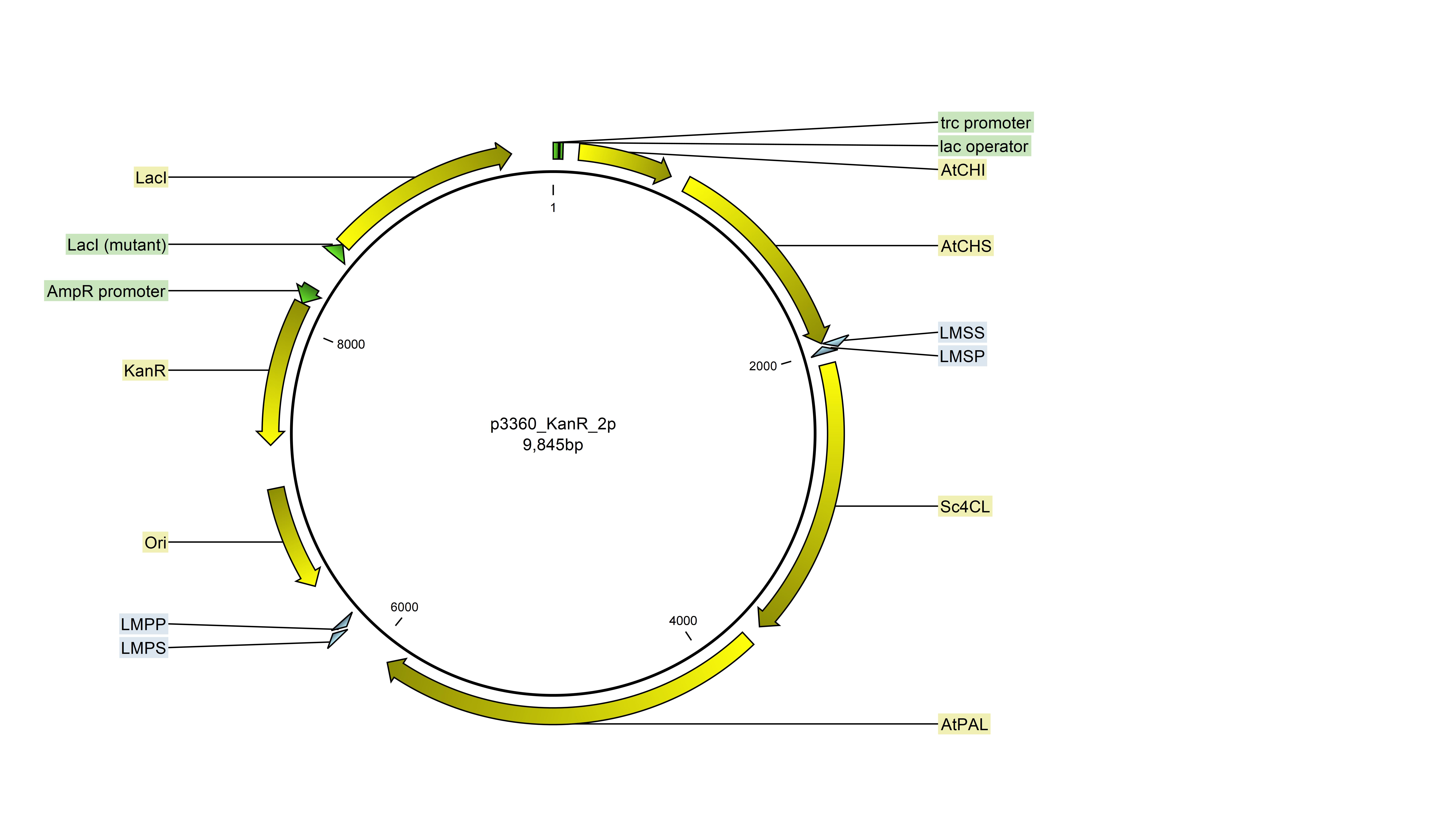 A portion of this plasmid was derived from a plasmid made byJBEI - ICE Inventory of composable elements, for gene sequences AtCHI, AtCHS, Sc4CL, and AtPAL. Alicia Da Silva and Jean-Loup Faulon at Micalis, INRAE, France for linkers used for the BASIC assembly.