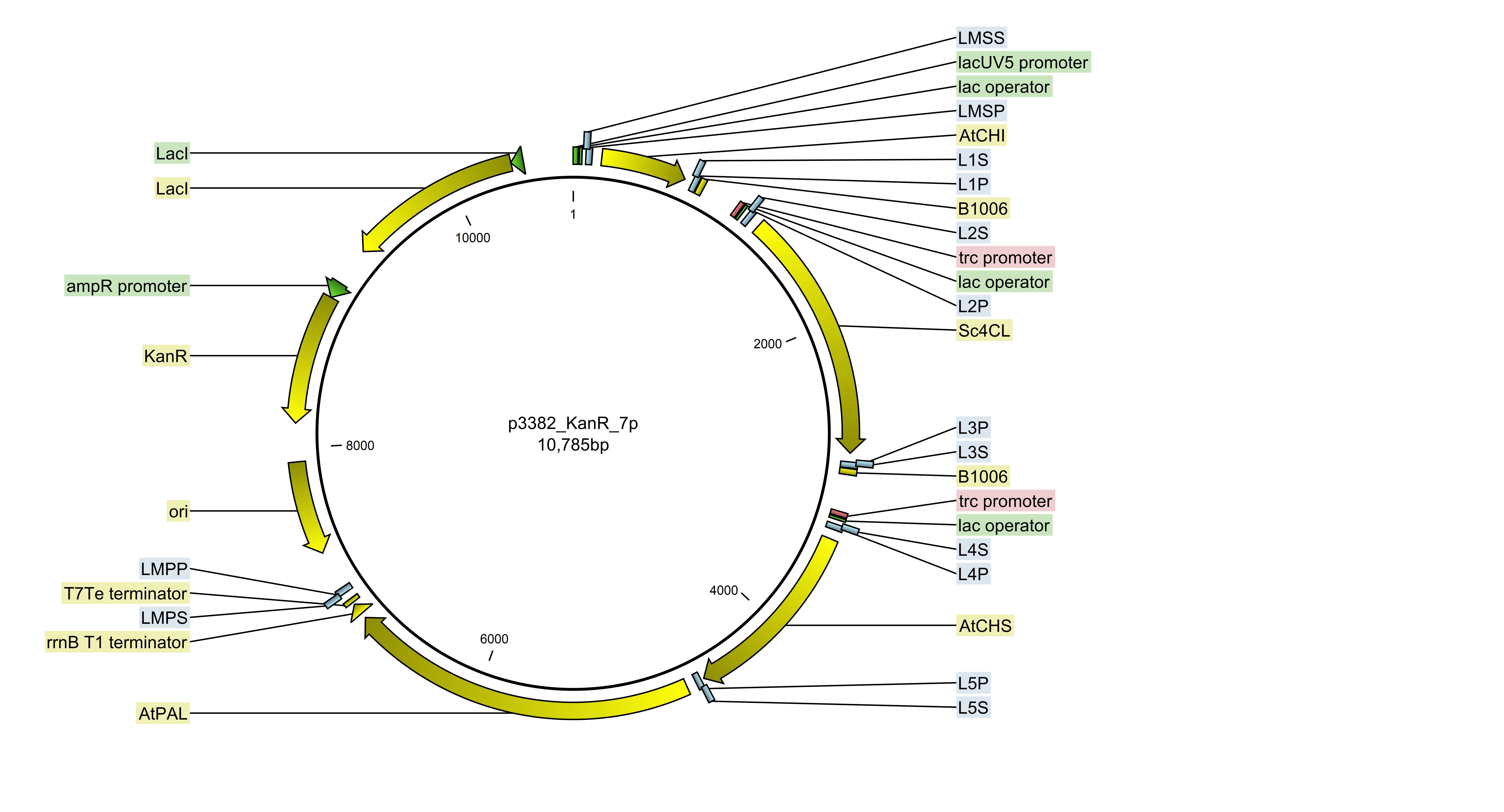 A portion of this plasmid was derived from a plasmid made byJBEI - ICE Inventory of composable elements, for gene sequences AtCHI, AtCHS, Sc4CL and AtPAL. Alicia Da Silva and Jean-Loup Faulon at Micalis, INRAE, France for linkers used for the BASIC assembly.