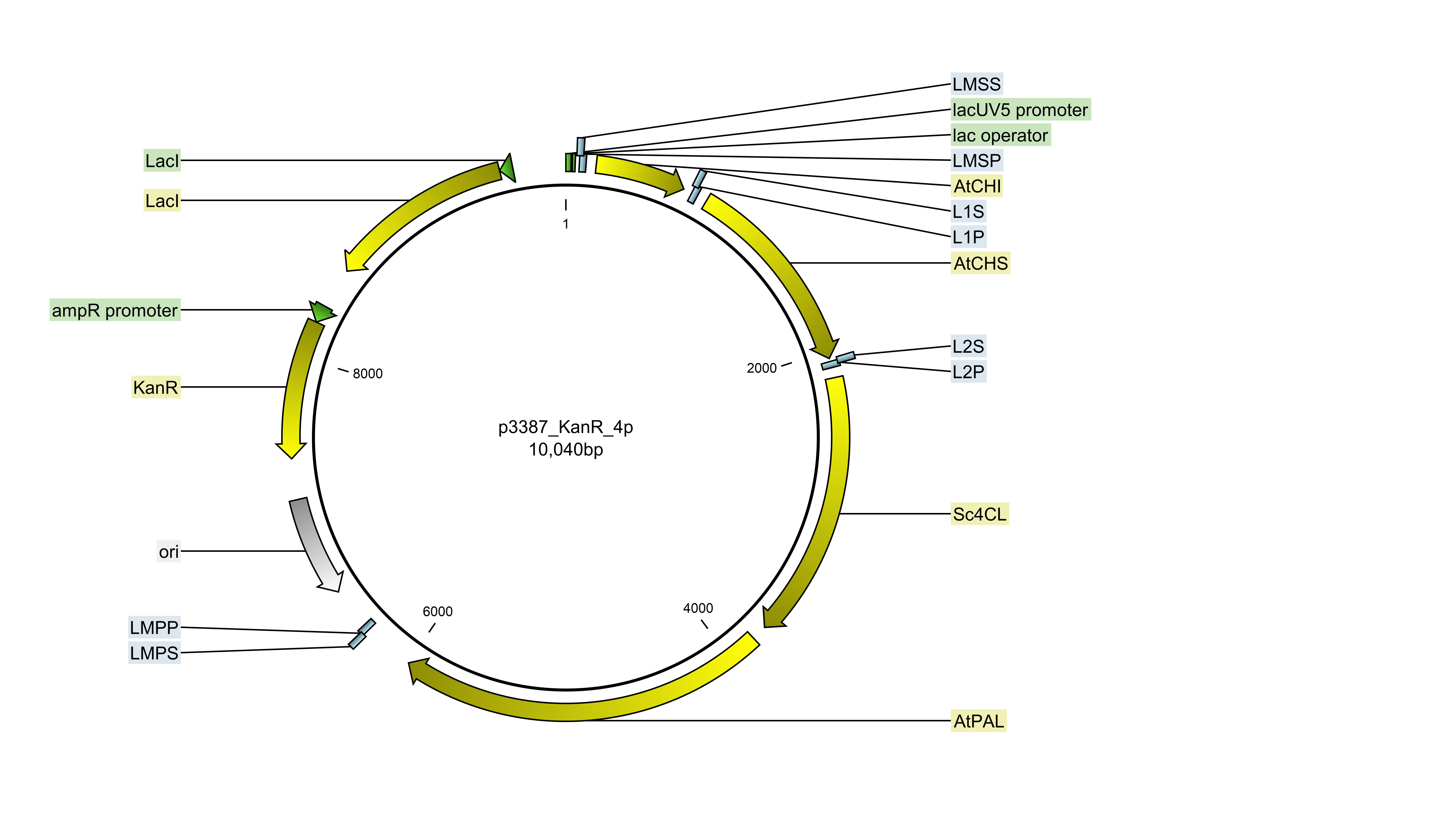 A portion of this plasmid was derived from a plasmid made byJBEI - ICE Inventory of composable elements, for gene sequences AtCHI, AtCHS, Sc4CL, and AtPAL. Alicia Da Silva and Jean-Loup Faulon at Micalis, INRAE, France for linkers used for the BASIC assembly.