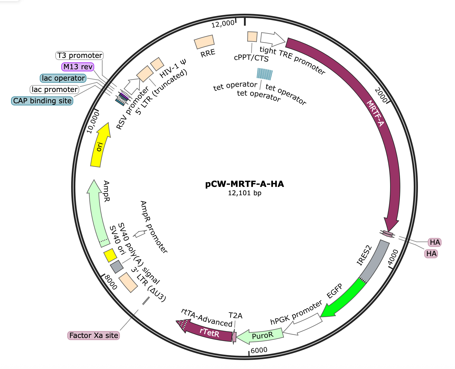 PurposesiRNA resistant HA-tagged mouse MRTF-A cloned into the pCW backbone (Addgene #41393, with puromycin resistance) together with an IRES GFP to indicate doxycycline-inducible expression by fluorescence.