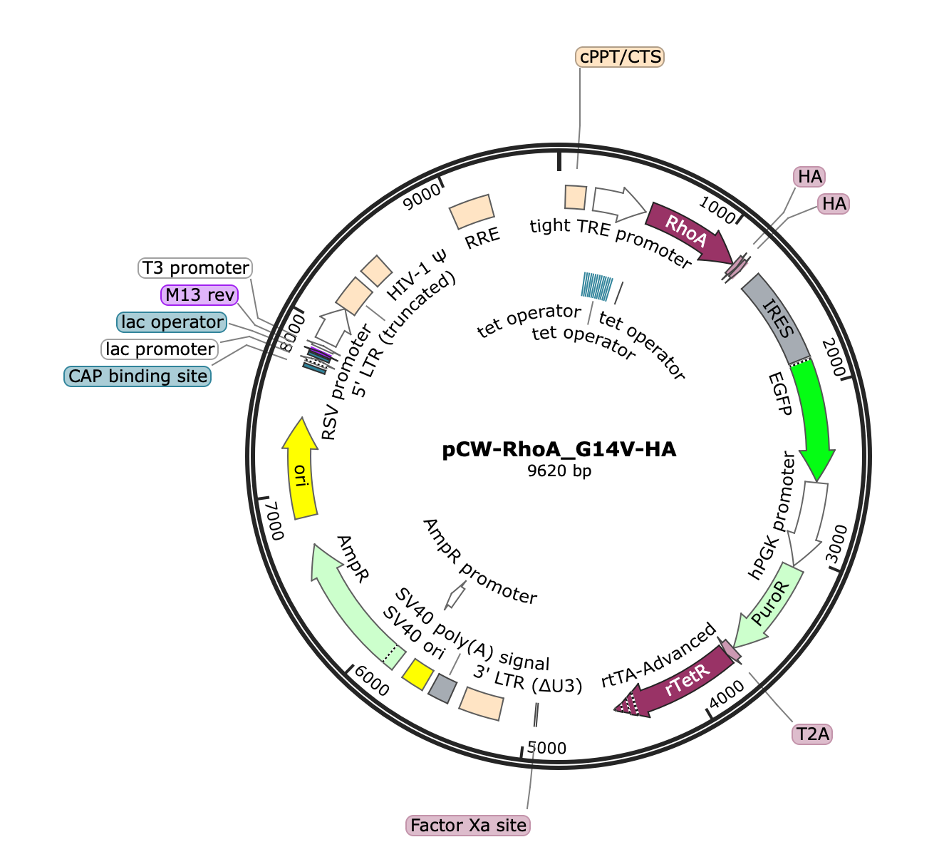 PurposeHA-tagged human RhoA(G14V) cloned into the pCW backbone (Addgene #41393, with puromycin resistance) together with an IRES GFP to indicate doxycycline-inducible expression by fluorescence.