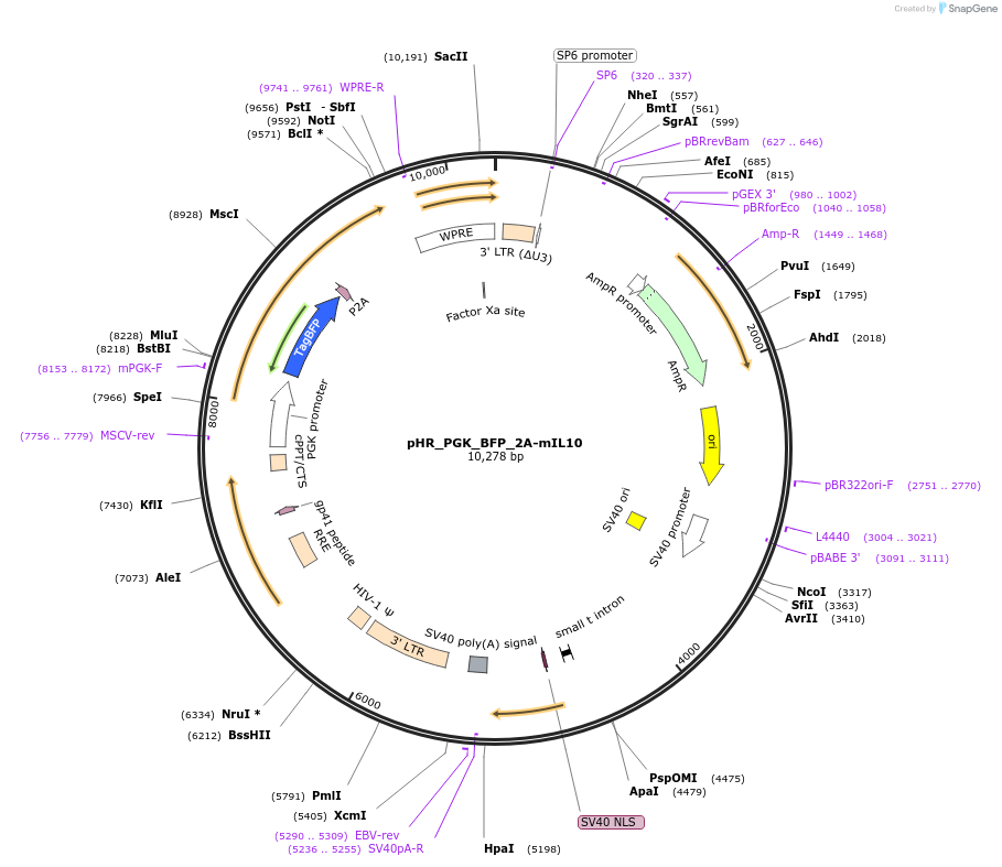 pHR_PGK_BFP_2A-mIL10 was a gift from Wendell Lim (Addgene plasmid # 247507 ; http://n2t.net/addgene:247507 ; RRID:Addgene_247507) -