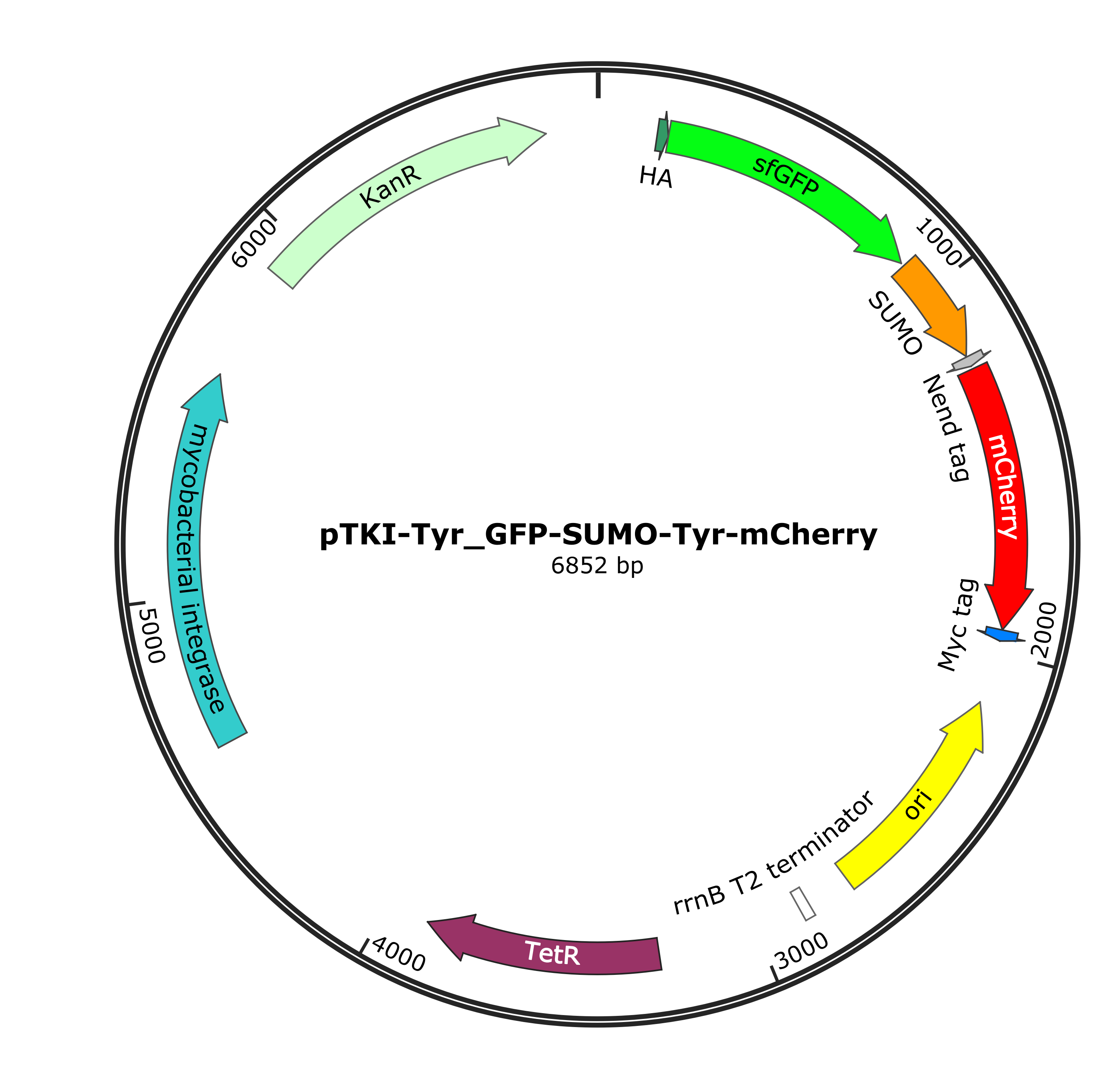 PurposeExpresses GFP-SUMO-Tyr-mCherry N-degron reporter driven by aTc responsive promoter, from KanR integrating mycobacterial plasmid lacking Ulp1
