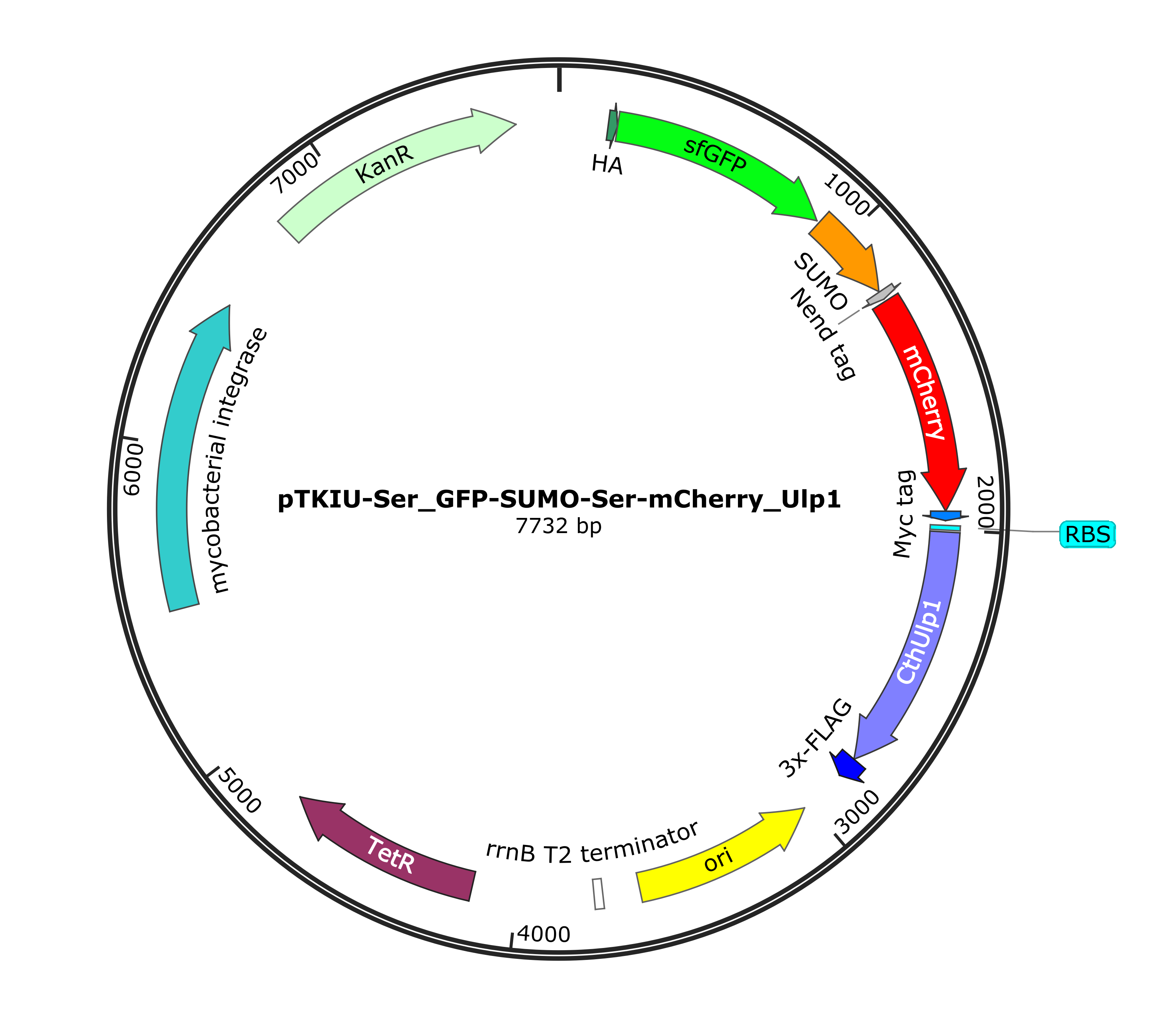PurposeExpresses GFP-SUMO-Ser-mCherry N-degron reporter driven by aTc responsive promoter, and constitutively expresses Ulp1, from KanR integrating mycobacterial plasmid