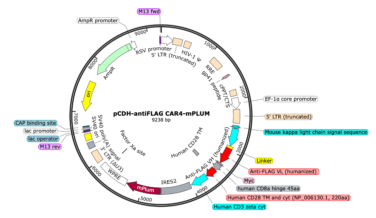 PurposeAnti-FLAG scFv with Myc-tag, human CD8α-truncated hinge, and human CD28-CD3z intracellular domain.