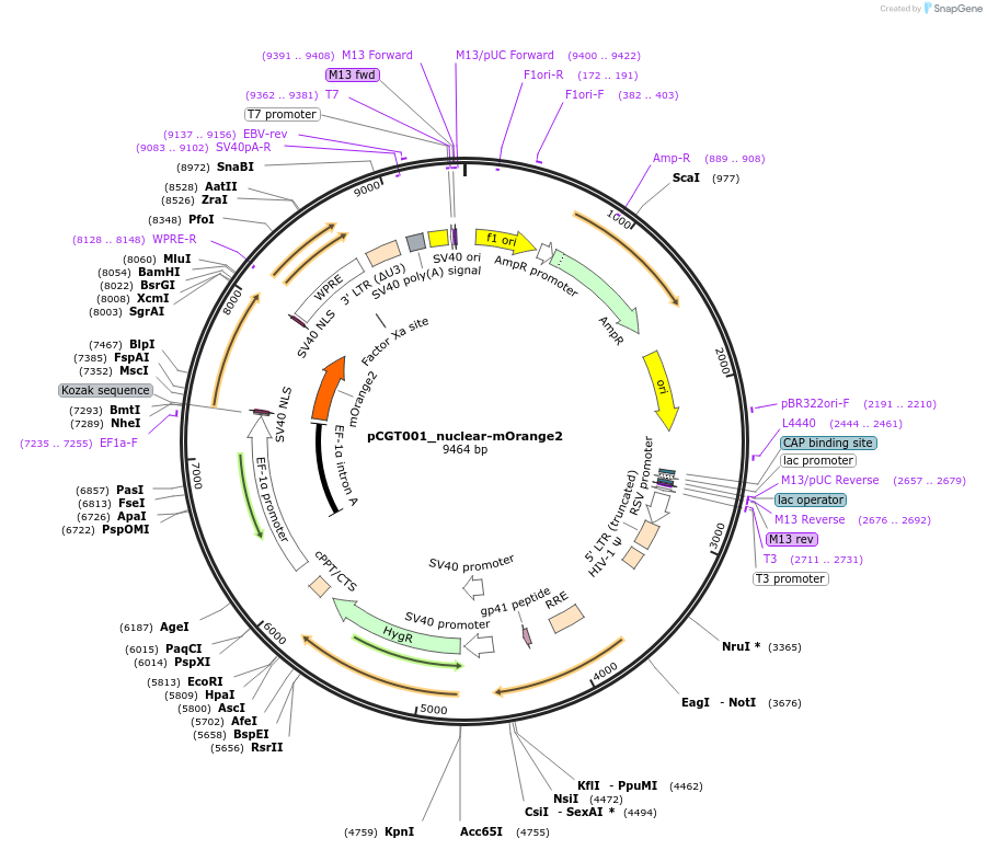PurposeConstitutive expression of NLS-tagged mOrange2 from EF1-alpha promoter (for lentiviral packaging)