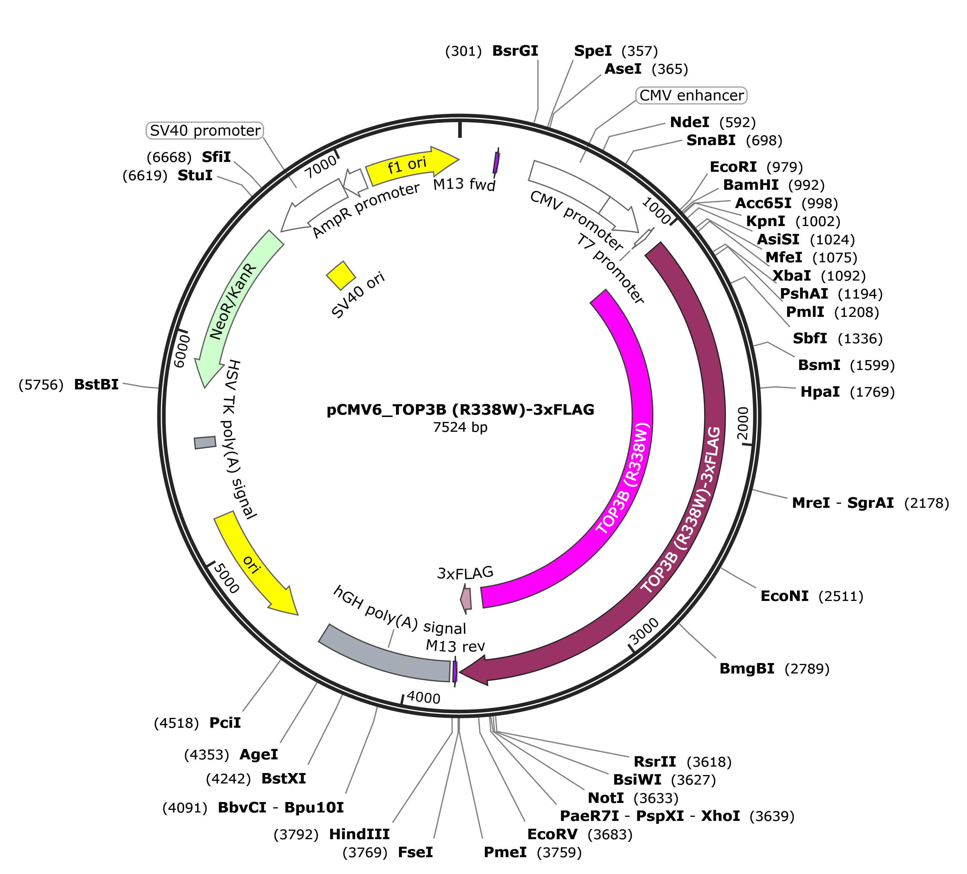 PurposeExpresses human TOP3B (R338W; "self-trapping" mutant) with a C-terminal 3xFLAG tag in mammalian cells