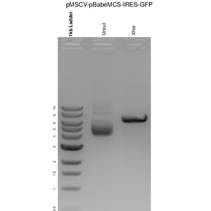 This gel depicts the NEB 1kb ladder and a digestion of the plasmid pMSCV-pBabeMCS-IRES-GFP with the following enzyme: XhoI.