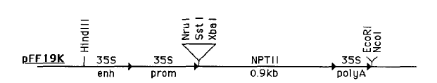 The pFF plasmids: cassettes utilising CaMV sequences for expression of foreign genes in plants. Timmermans MC, Maliga P, Vieira J, Messing J. J Biotechnol. 1990 Jun;14(3-4):333-44. 10.1016/0168-1656(90)90117-T PubMed 1369289