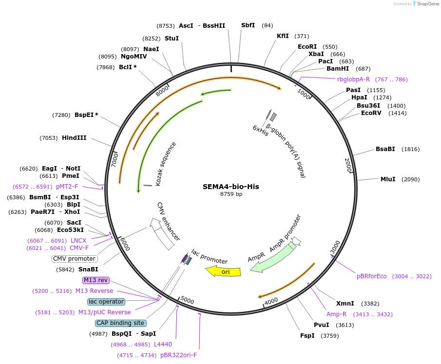 PurposeExpresses full-length Semaphorin-4D precursor ectodomain in mammalian cells. C-terminal rat Cd4d3+4 tag, biotinylation sequence and His tag.
