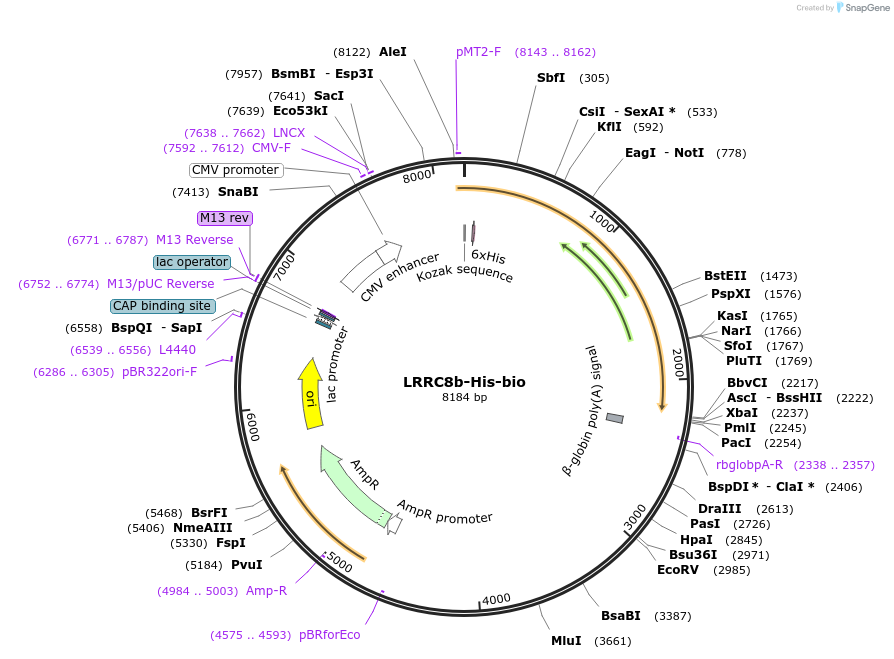 PurposeExpresses full-length Leucine rich repeat containing 8 family, member B ectodomain in mammalian cells. N-terminal His tag, biotinylation sequence and rat Cd4d3+4 tag.