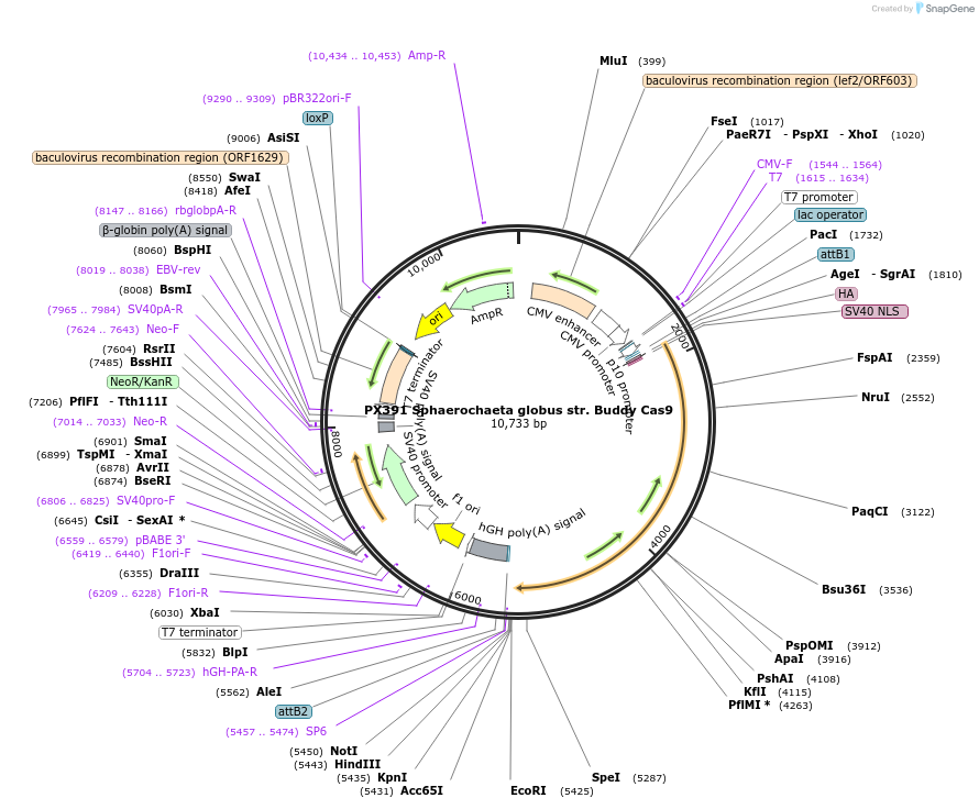 PX391 Sphaerochaeta globus str. Buddy Cas9 was a gift from Feng Zhang (Addgene plasmid # 68328 ; http://n2t.net/addgene:68328 ; RRID:Addgene_68328)