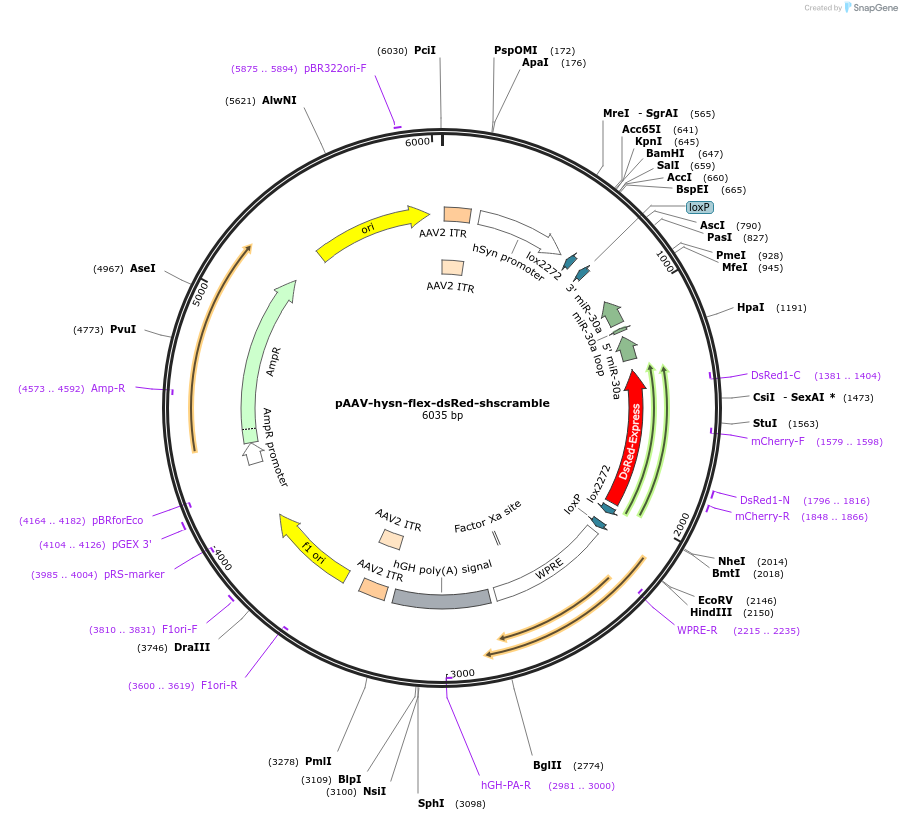 Gene/Insert namehuman synapsin promoter-flex switch-dsRed-shscramble