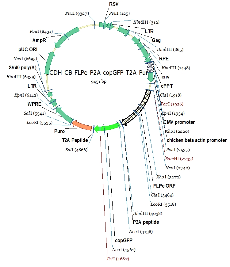 PurposeExpress FLPe, copGFP and Puromycin resistance gene under CB promoter