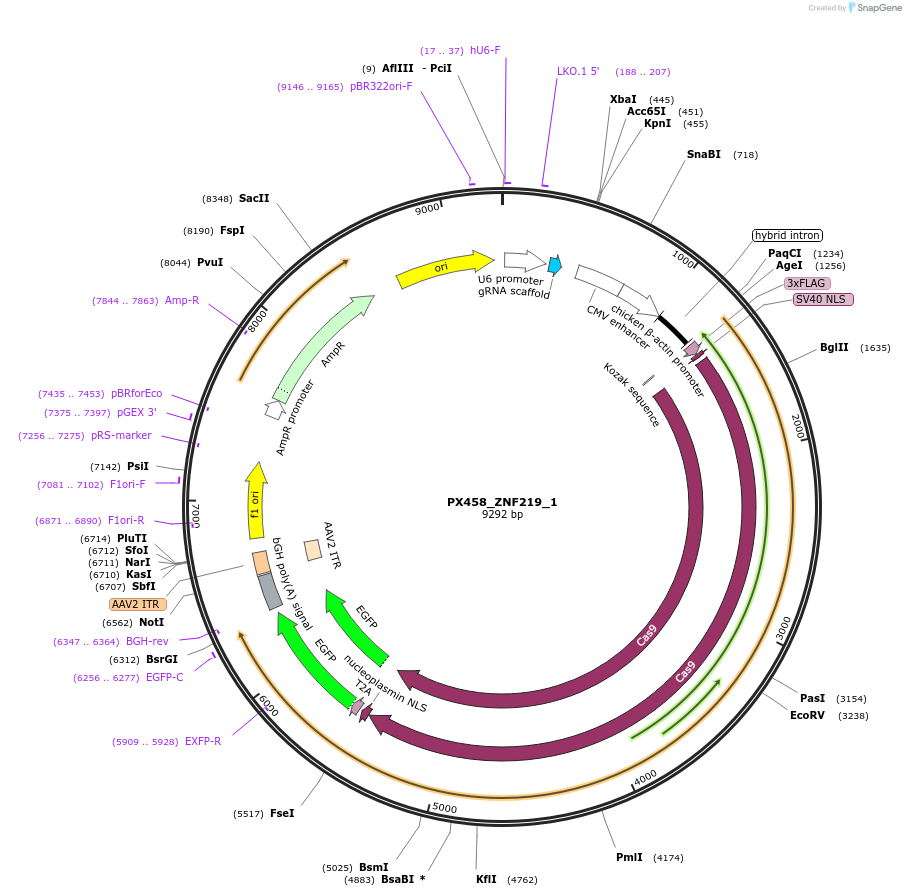 PurposeEncodes gRNA for 3' target of human ZNF219 along with Cas9 with 2A GFP