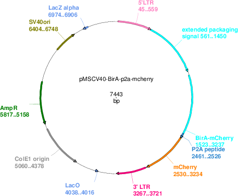 Purposeretroviral expression plasmid for selfcleaving E.coli biotin ligase BirA-P2A-mCherry fusion protein