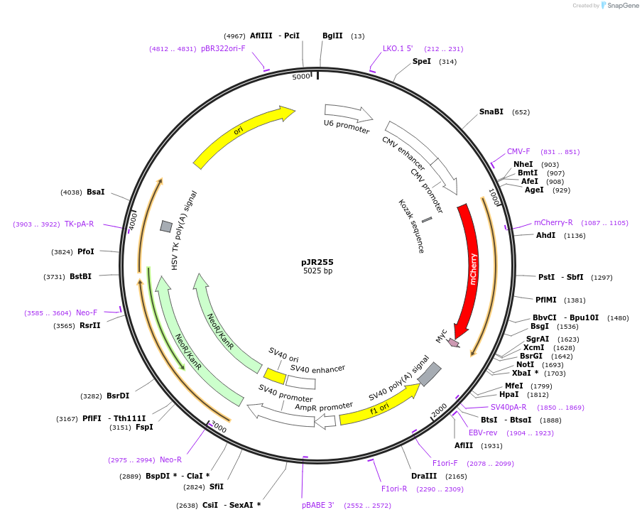 Purpose(Empty Backbone) For expressing small noncoding RNAs from U6 promoter. One step cloning of oiigonucleotide pairs containing CACC and AAAA overhangs. CMV driven mCherry visible marker.
