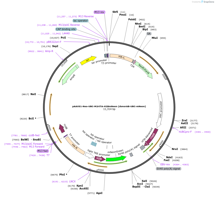 pAAVS1-Neo-UBC-M2rtTA-H2BmNeon (donorAB-UBC-mNeon) was a gift from Roland Friedel (Addgene plasmid # 85800 ; http://n2t.net/addgene:85800 ; RRID:Addgene_85800) -