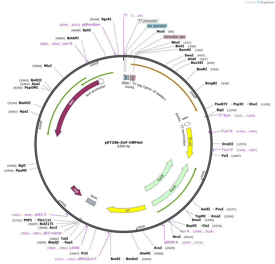 pET28b-ZnF-UBPdel was a gift from Christine Guthrie (Addgene plasmid # 90299 ; http://n2t.net/addgene:90299 ; RRID:Addgene_90299) -