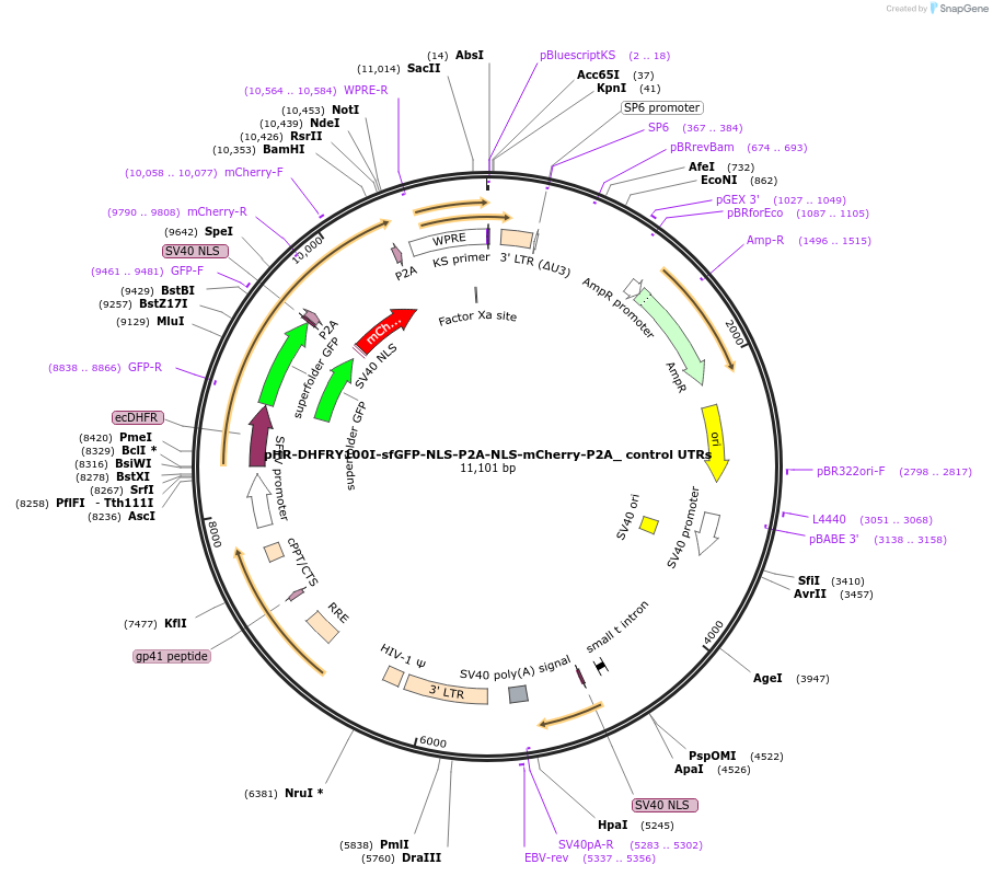pHR-DHFRY100I-sfGFP-NLS-P2A-NLS-mCherry-P2A_ control UTRs