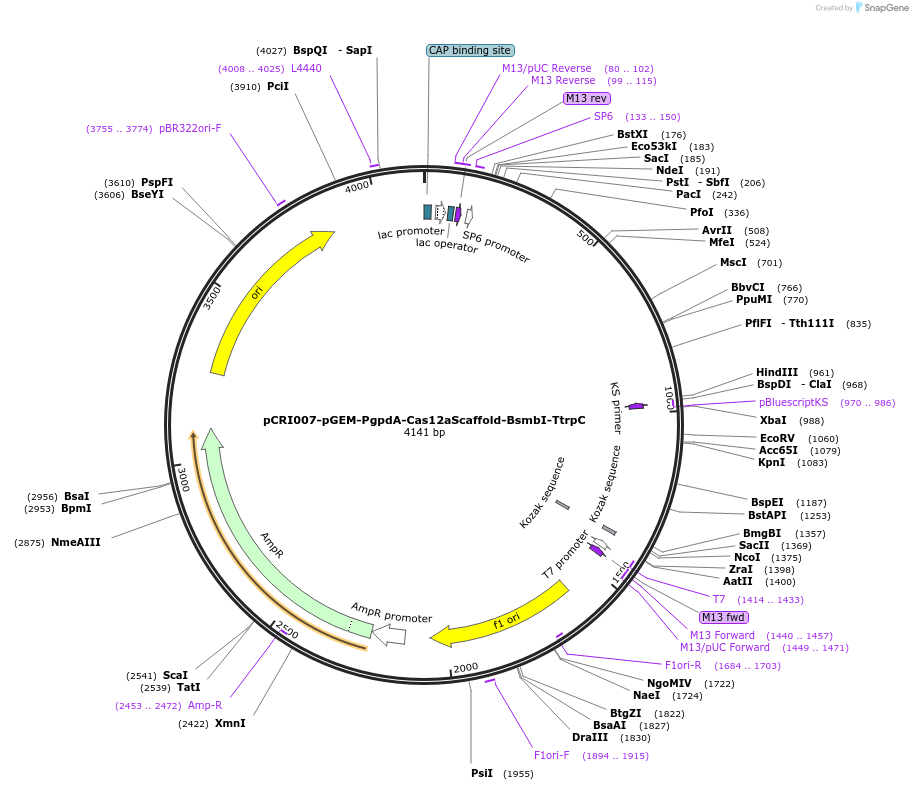 Plasmid#140200PurposeCloning vector for LbCas12a crRNAs ( Step 1 of the 2-step cloning alternative). Full PgpdA sequence is reconstituted when amplifying the expression cassette for cloning in a fungal vector.DepositorTypeEmpty backboneUseCRISPR and Synthetic BiologyTagsdLbCas12a crRNA scaffoldPromoterPgpdAAvailable SinceSept. 2, 2020AvailabilityAcademic Institutions and Nonprofits only